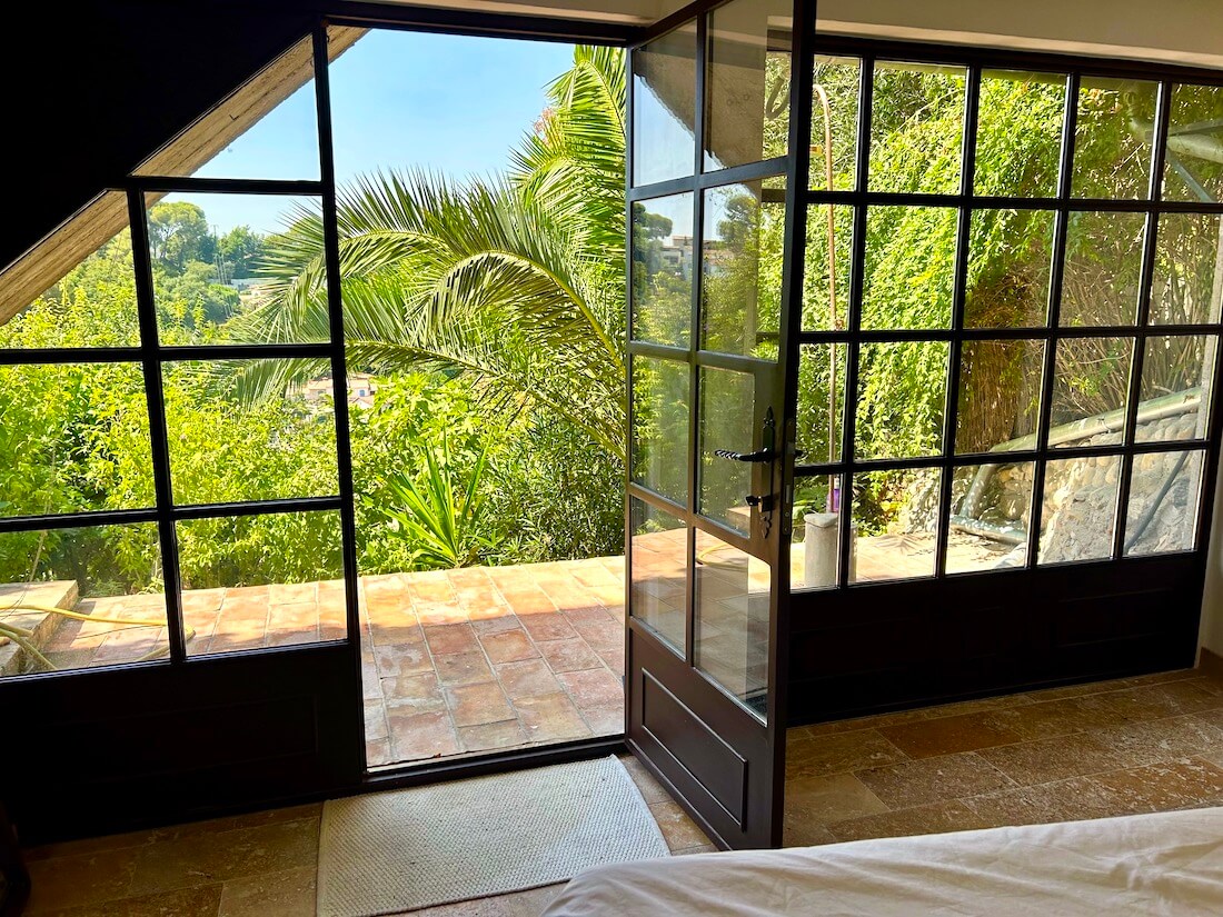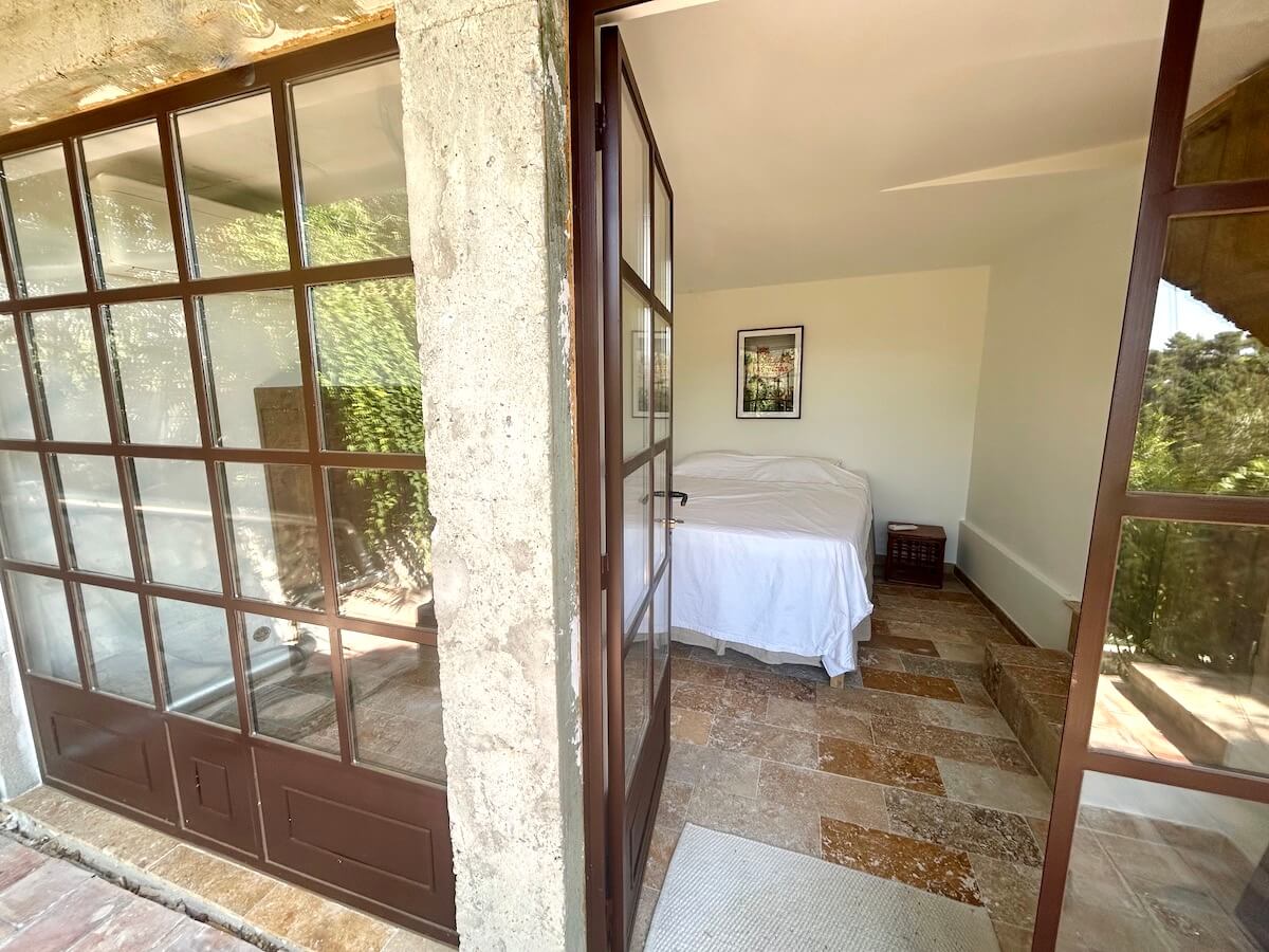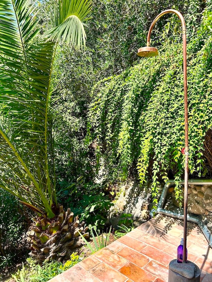 This level also offers an independent studio bedroom with double bed, air con and ensuite bathroom. Contemporary metal doors over look the garden, giving it a sense of being a natural, hidden gem. There is also an exterior shower situated in front of the studio.