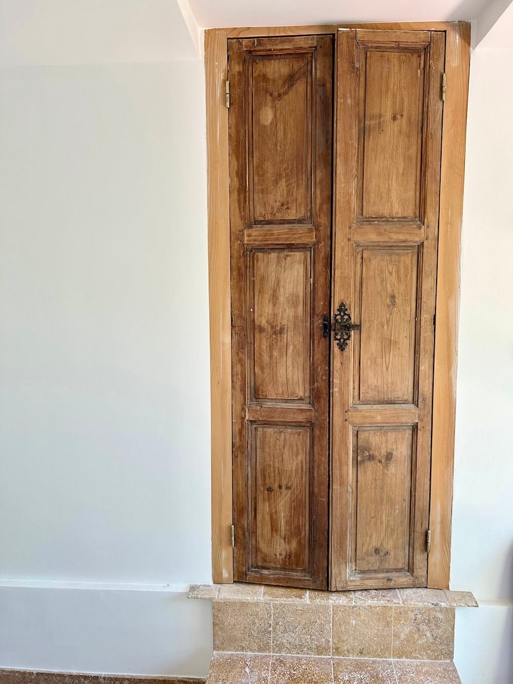 Situated off a narrow, village street in the medieval village – La Maison de la Mer is a short stroll to the main Castle Square and a less than 10 minute walk into the town below with all its commodities. The house is situated on 2 levels – enter a large wooden door into entrance hallway with coat rack and mirror – this is the sleeping level. There are 2 double bedrooms with 160cm beds and one single bedroom. Wooden flooring runs throughout and each bedroom has air con, storage space plus mosquito nets and shutters on the windows. The 2 double bedrooms are simple and white and the single bedroom with desk is in duck egg blue and white. There is also a good sized bathroom conveniently located on this level too. This provides a w.c, large walk-in shower and wash hand basin. Tiles are cream and there is a window for ventilation.