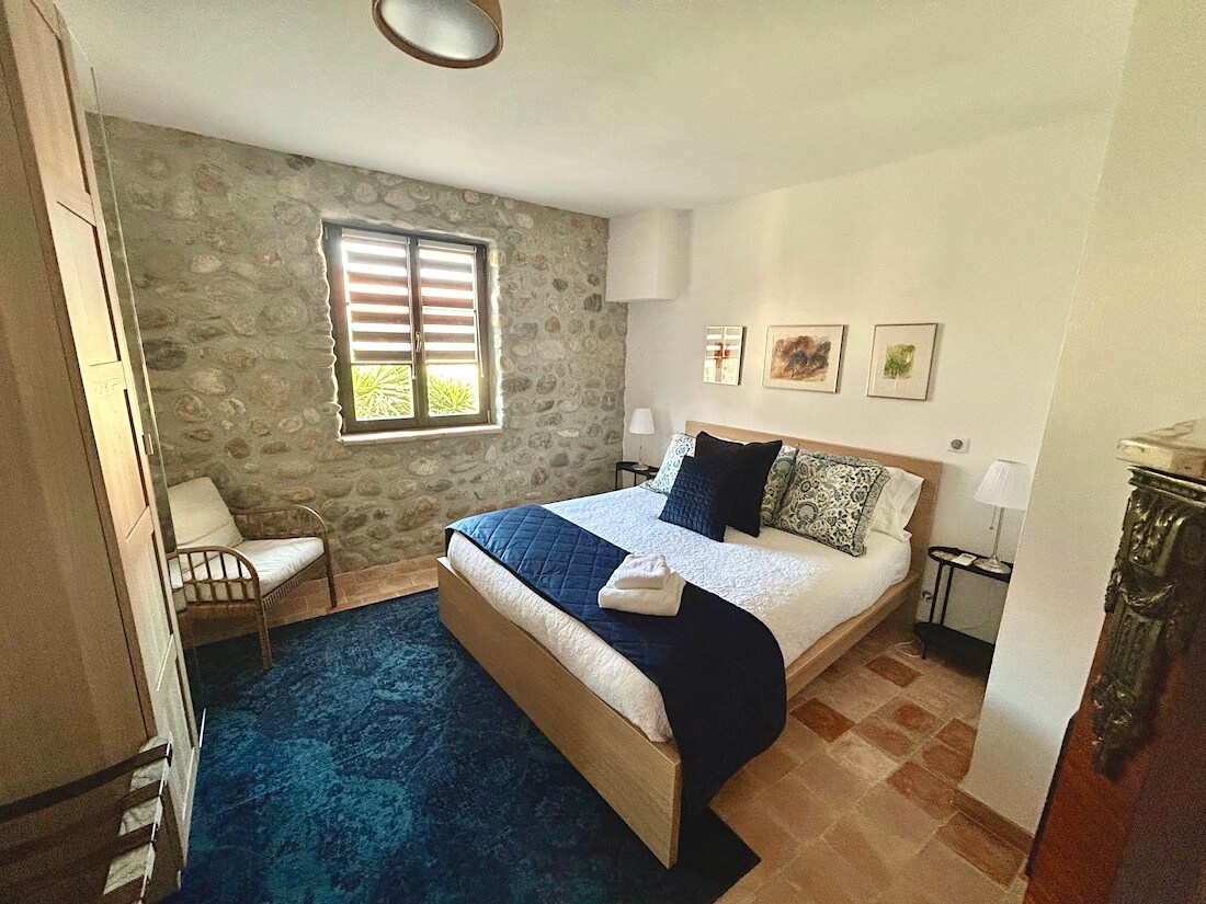 The last bedroom is the main bedroom with French doors that open over the garden. The bed is 190cm, there is a stone wall detail and ensuite bathroom in beige and white with walk-in shower, w.c and wash hand basin. The bedroom has 2 comfy armchairs, an armoire, chest of drawers and bedside tables with lamps.