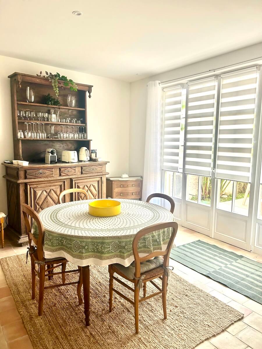 Enter directly into the sitting room area with L shaped sofa and armchairs, a coffee table, poufs plus a huge television screen. From here there is access into the garden. Behind the sitting area is a large, contemporary, wooden dining table with 6 chairs. The kitchen is also contemporary in style in grey and beige. There is a butcher’s table adding additional space and storage plus a round, kitchen table with chairs and dresser. French doors provide another access to the garden. The oven is electric with an induction cooktop with 4 heating points. Additionally there is a microwave, fridge/freezer, Nespresso machine, French press coffee pot, teapot and dishwasher.