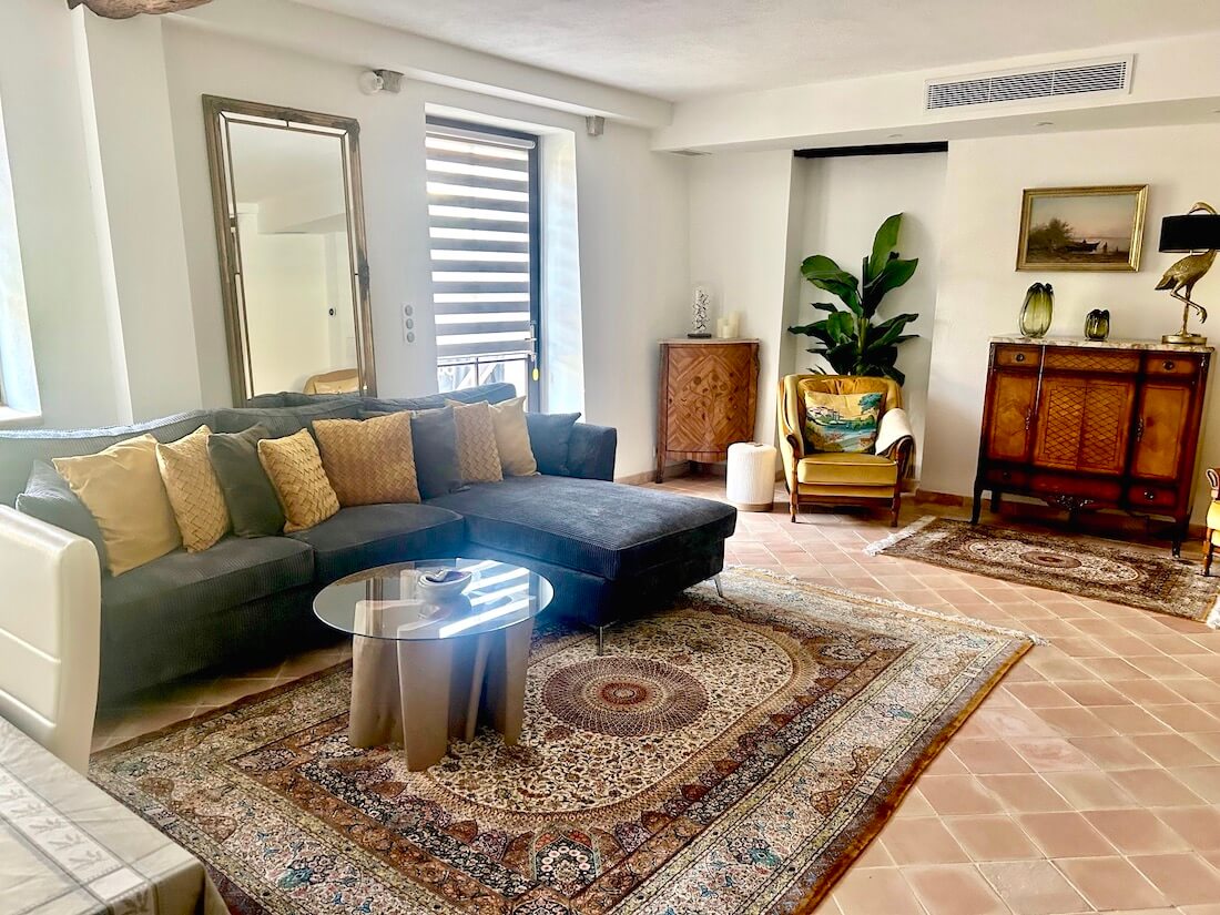 Next level is the garden level. This wonderful open plan living-dining-kitchen is really bright, inviting and tastefully decorated. There are ceiling beams, terracotta flooring and air con.